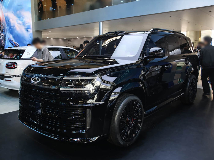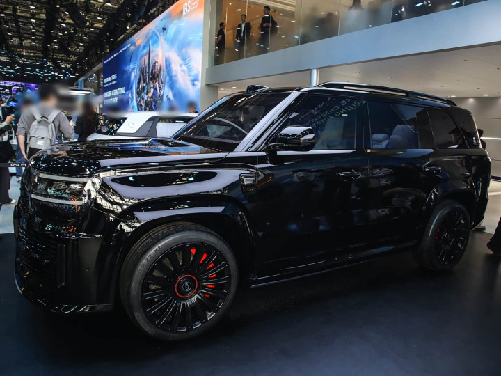 再来看车尾部分,车尾延续方正硬派风格,与前脸首尾呼应。贯穿式点阵 LED 尾灯横向拉伸,灯带亮度均匀,中央发光 LOGO 与前脸呼应,夜间点亮辨识度极高。尾灯下方内凹式设计,搭配大面积熏黑饰板,营造分层视觉效果,弱化车尾厚重感。后包围采用双层设计,上半部分与车身同色,下半部分黑色防刮材质,两侧预留反光灯组,底部隐藏式排气布局,强化新能源属性。一体式高位扰流板略微上翘,提升运动感;车尾线条平直硬朗,沉稳大气,与车头、侧面的硬派气质统一。